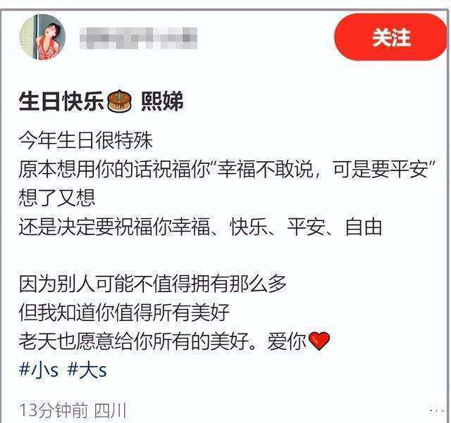 也许,本年的诞辰,对小S来说,是一个新的运转。她会再行疑望我方的东说念主生,找到新的标的。她会带着姐姐的那份爱,络续勇敢前行。