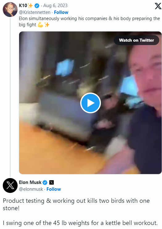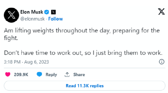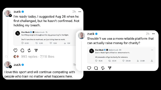 笼斗的缘由,始于马斯克回复了一条对于Twitter竞争敌手Threads的推文,他讥笑全国变得“王人备在扎克的截至之下,别无遴荐”,接着,一位Twitter用户开玩笑地申饬这位特斯拉首席奉行官,他的竞争敌手正在进行柔术熟谙。